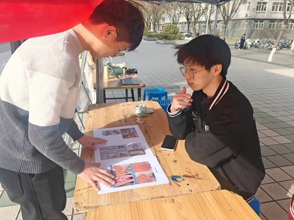 环保知识竞答,赢取绿色好礼。“环保知识竞答”环节吸引了众多同学积极参与,每套题目涵盖了环保知识、绿色生活等多个方面,既有趣味性又具挑战性。活动现场为大家准备了精美的小盆栽和树叶形书签,参与者们认真思考,踊跃答题。此外,活动还联动了“挑战杯”,志愿者为同学们科普了关于“挑战杯”大学生课外学术科技作品竞赛的相关内容。